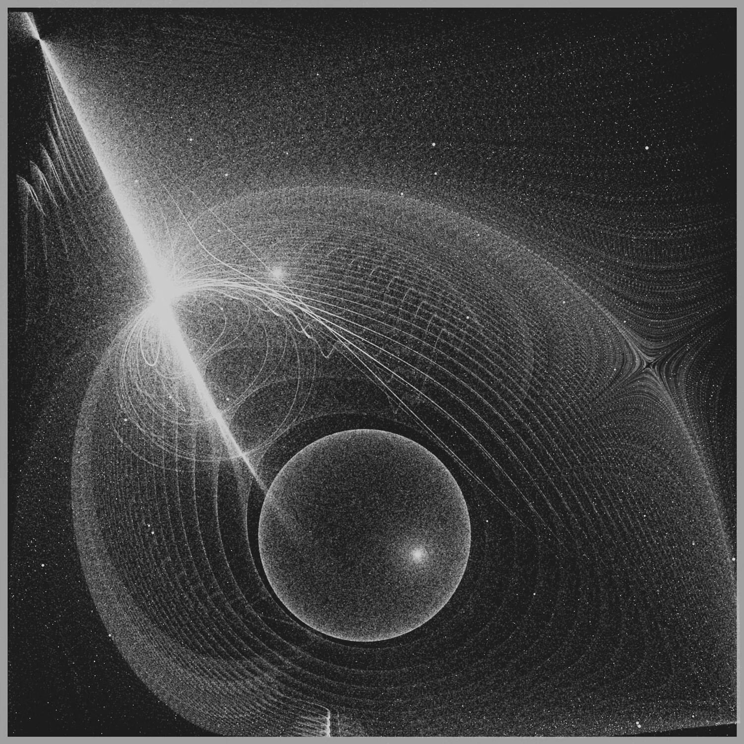 Overall, this code creates an interactive animation where agents (stars) are attracted to attractors (planets) based on gravitational forces. The appearance and behavior of the animation are influenced by various parameters, such as the number of planets, magnetic power, planet masses, colors, noise scale, gamma radiation.